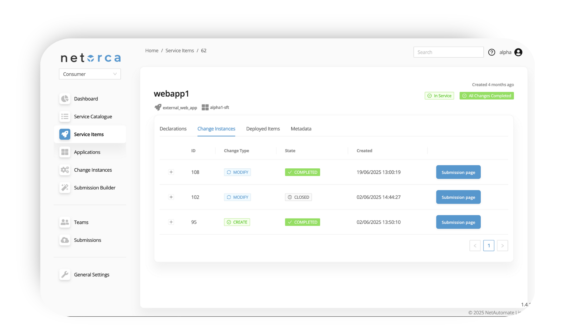 Centralised management of changes to instances of the Services your team provides. Additions,Modifications and Deletions are detected automatically based on the Consumer input. Service Owners then have full flexibilty in how those changes are implemented, whether through manual or automated methods.